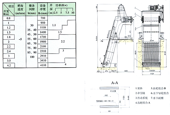 反撈格柵主要由架體、牽引鏈、傳動系統(tǒng)、齒耙組合、水下導輪組合等組成。