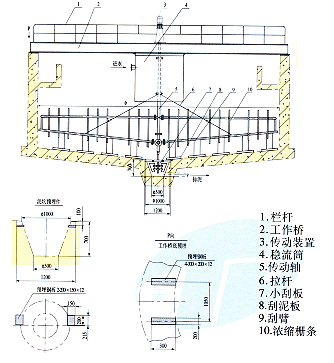 濃縮機(jī)由中心傳動(dòng)裝置驅(qū)動(dòng)傳動(dòng)軸、刮臂等旋轉(zhuǎn),刮臂上的刮板將污泥由池邊逐漸刮至池中心的泥坑中,通過(guò)排泥管排出池外;刮臂上固定有攪拌柵條,旋轉(zhuǎn)時(shí)提供絮狀污泥的沉淀空間,加速污泥的下沉,提高濃縮效果。