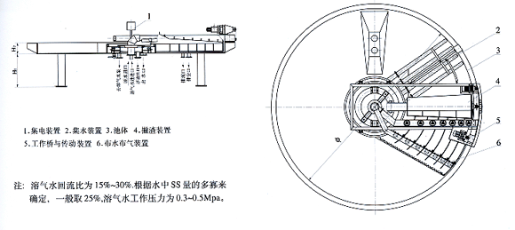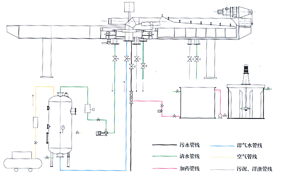 氣浮法是通過向水中溶入大量的空氣,形成溶氣水,減壓釋放后的溶氣水放出大量的微細(xì)氣泡,氣泡與水中的雜質(zhì)互相粘附,形成比重小于水的浮體,雜質(zhì)浮出水面后在刮渣裝置的作用下與水體分離。